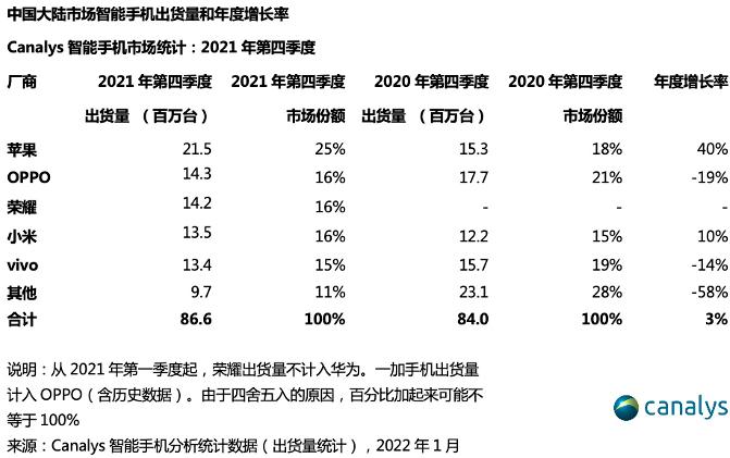 资料来源:Canalys智能手机分析统计数据(出货量统计),2022年1月