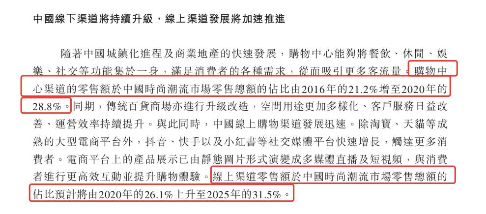 百丽招股书所援引的弗若斯特沙利文报告显示,2016年与2020年相比,中国时尚潮流市场中,百货渠道的收入占比从28%降至19%。购物中心和线上渠道的收入规模则在不断扩大。购物中心渠道产生的零售额占比从2016年的21.2%上升到2020年的28.8%。