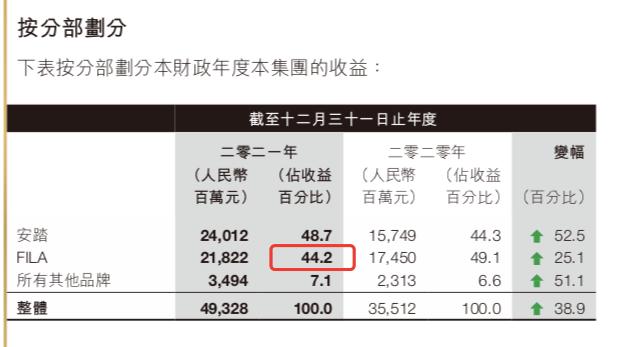 FILA自归于安踏之后,为安踏实现了“再造一个安踏”的梦想。据安踏最新财报,FILA收入占比达44.2%,俨然已经成为了安踏的半壁江山。