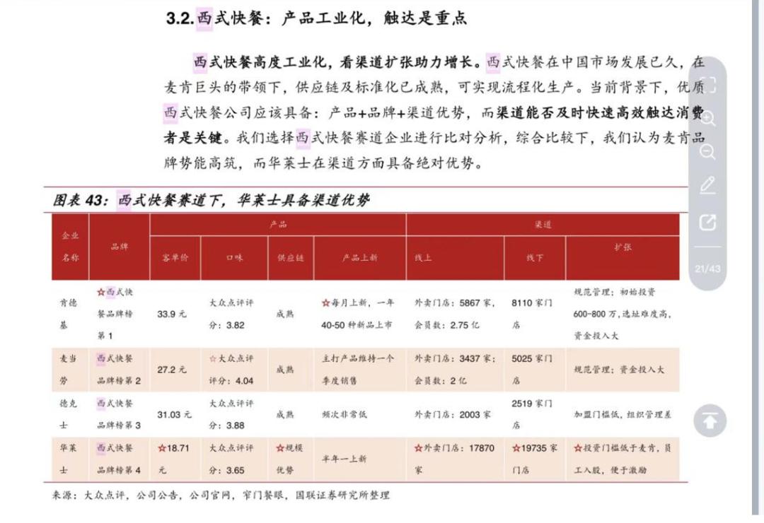 国联证券研报显示,截至2021年11月,肯德基、麦当劳、德克士与华莱士四大西式快餐品牌在国内的线下门店数量,分别达到了8110家、5025家、2519家以及19735家。