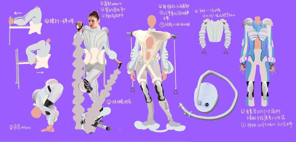 设计理念:我们结合便携式健身器材和软体材料改造服装,穿着者可以通过这件健身服感受身体各部和器材之间的交互、拮抗,以体验我们所描绘的未来。我们用便携式健身器材和柔性材料,在2022年的今天描绘出这样一个穿在身上的趣味健身房。
