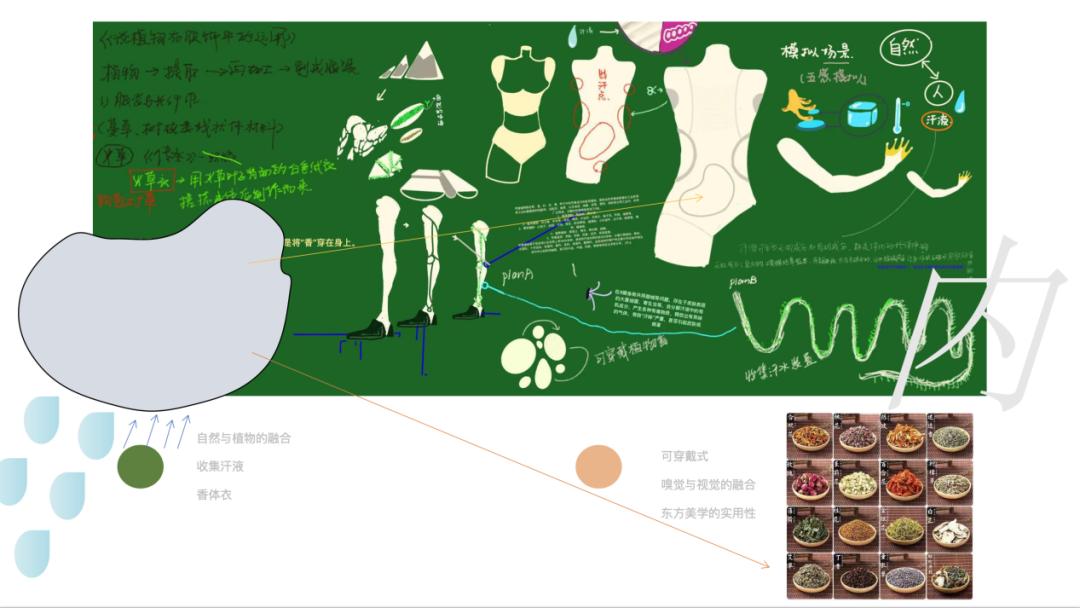 设计理念:健身服的设计由贴身内搭、连体外套、可拆卸元素三部分组成。内搭分布有可替换天然香片,吸汗除菌的同时散发芬芳;外套运用轻薄、高强度的防水面料;在正侧面设计带状透气口;在肩部、肘部和膝部加厚缓震;可拆卸元素选用翼装飞行的羽翼,运用创新三片式结构还原虹膜和蝉翼之美。全套健身服将生物特有的功能加以改造和运用,并通过时尚元素的加入让人们爱上运动,从运动中感受生命的律动,珍惜自然带给人们的生机和喜悦。
