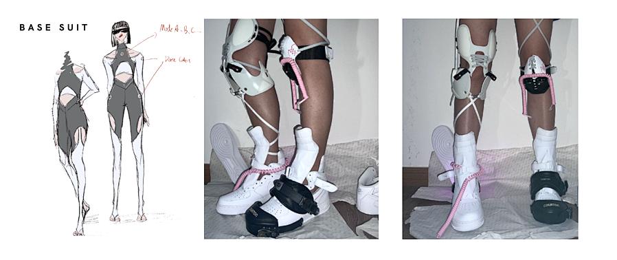 背景设定:这是一个基于意识数据化时代身体训练的可穿戴时尚设计。在我们所构想的2050年,意识数据化技术成熟,人类可以作为意识登陆任意一种物质形态。那时的“健身服”是一个躯体、一件衣服、一个穿在身上的健身房,更是一个能够满足训练娱乐需求的服务器。登入“健身服”,便可以通过训练和体育活动体验前所未有的精彩,强化身心感知。