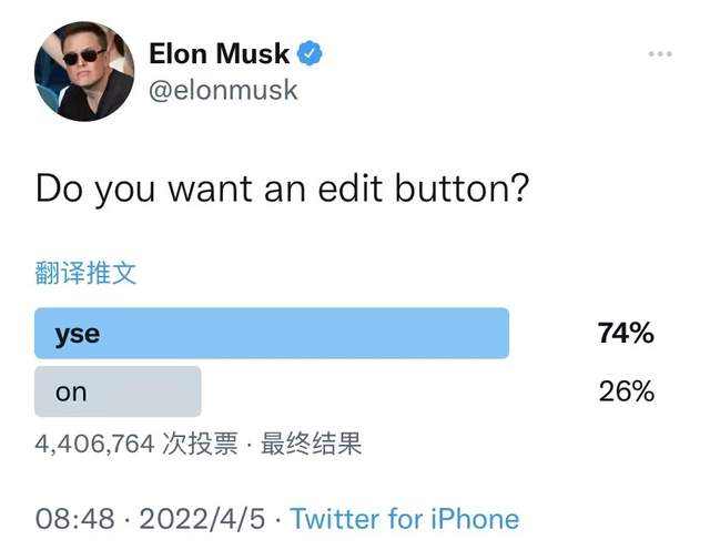 就在SEC文件披露的同一天,马斯克在推特上发起一项投票:“你们想要一个编辑按钮吗?”在440万的调查参与者中,有73.6%投了赞成票。推特随后澄清,“自去年以来就在测试编辑功能,并非因为一次投票”,但在此之前推特前首席执行官杰克·多西曾表示,推特可能永远不会推出编辑功能。马斯克对推特的影响已经初显,而这仅仅只是开始。