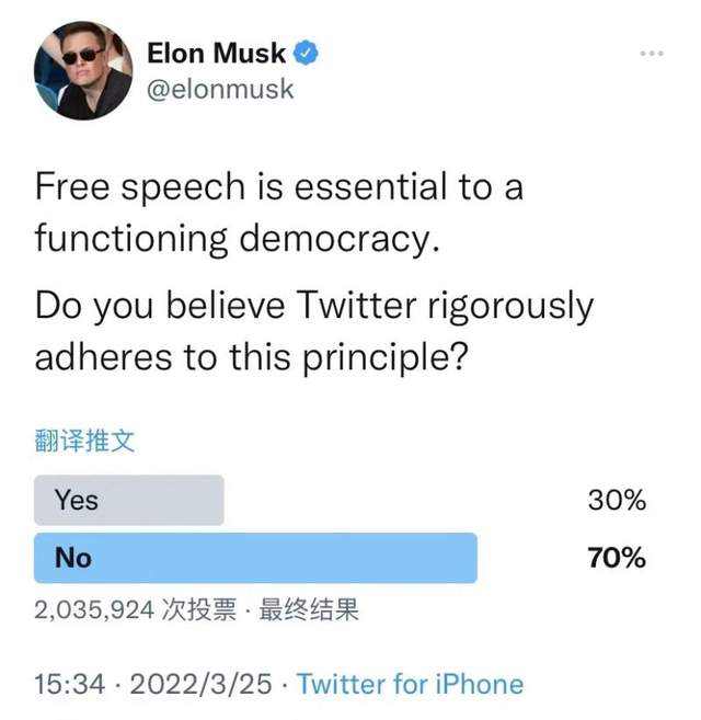 今年3月,马斯克在个人推特上发布一项投票,询问粉丝:“你觉得推特有遵守‘言论自由’的原则吗?”他还暗示道:“这个投票相当重要。请小心投下你的一票。”如今看来,这是马斯克对入主推特的一次预告。
