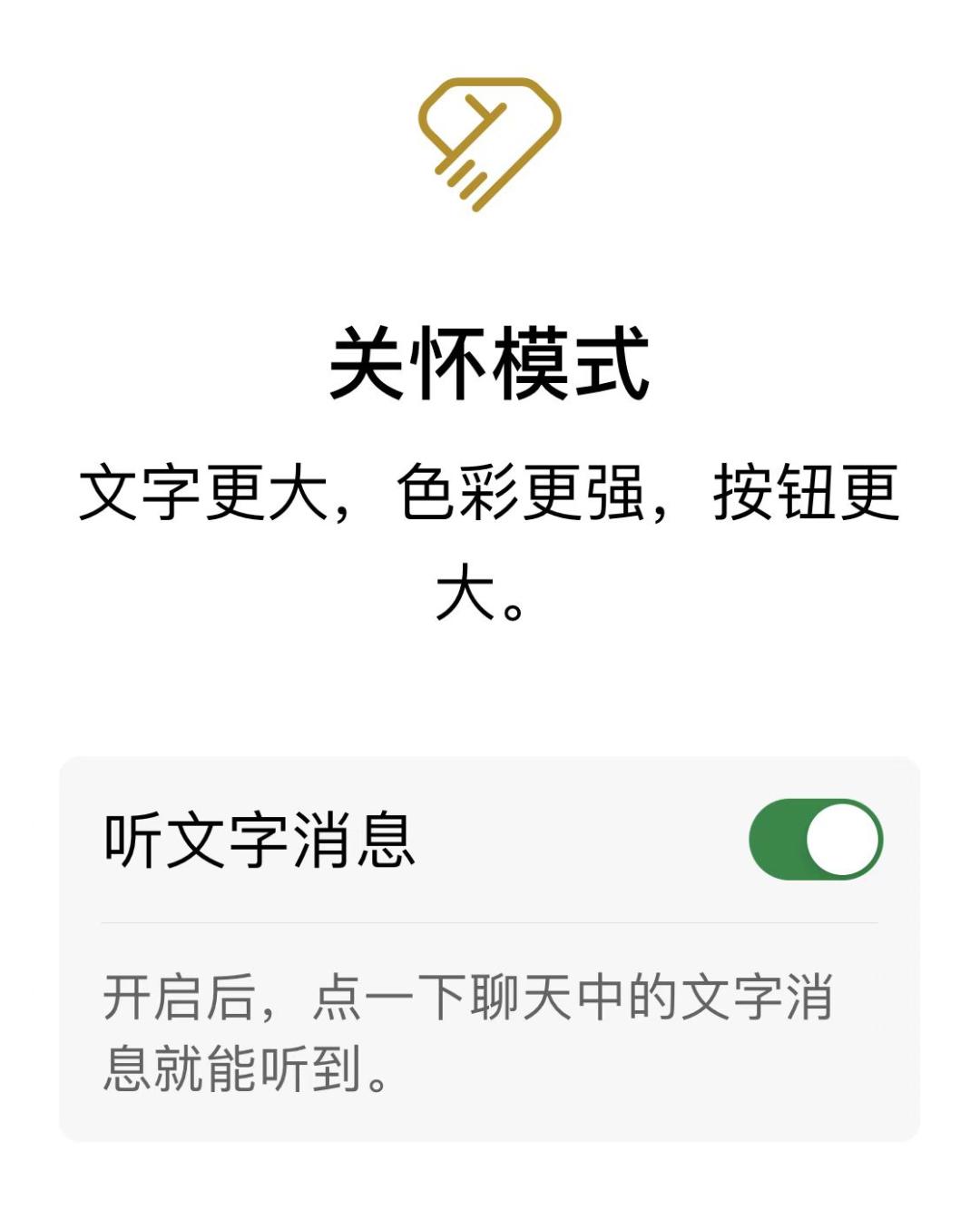 首先需要说明的是,“听文字消息”是微信关怀模式下的子功能,进入关怀模式后才能选择是否启用。微信关怀模式提供了更大的文字和界面,主要为老人和其他存在视力障碍的用户服务。