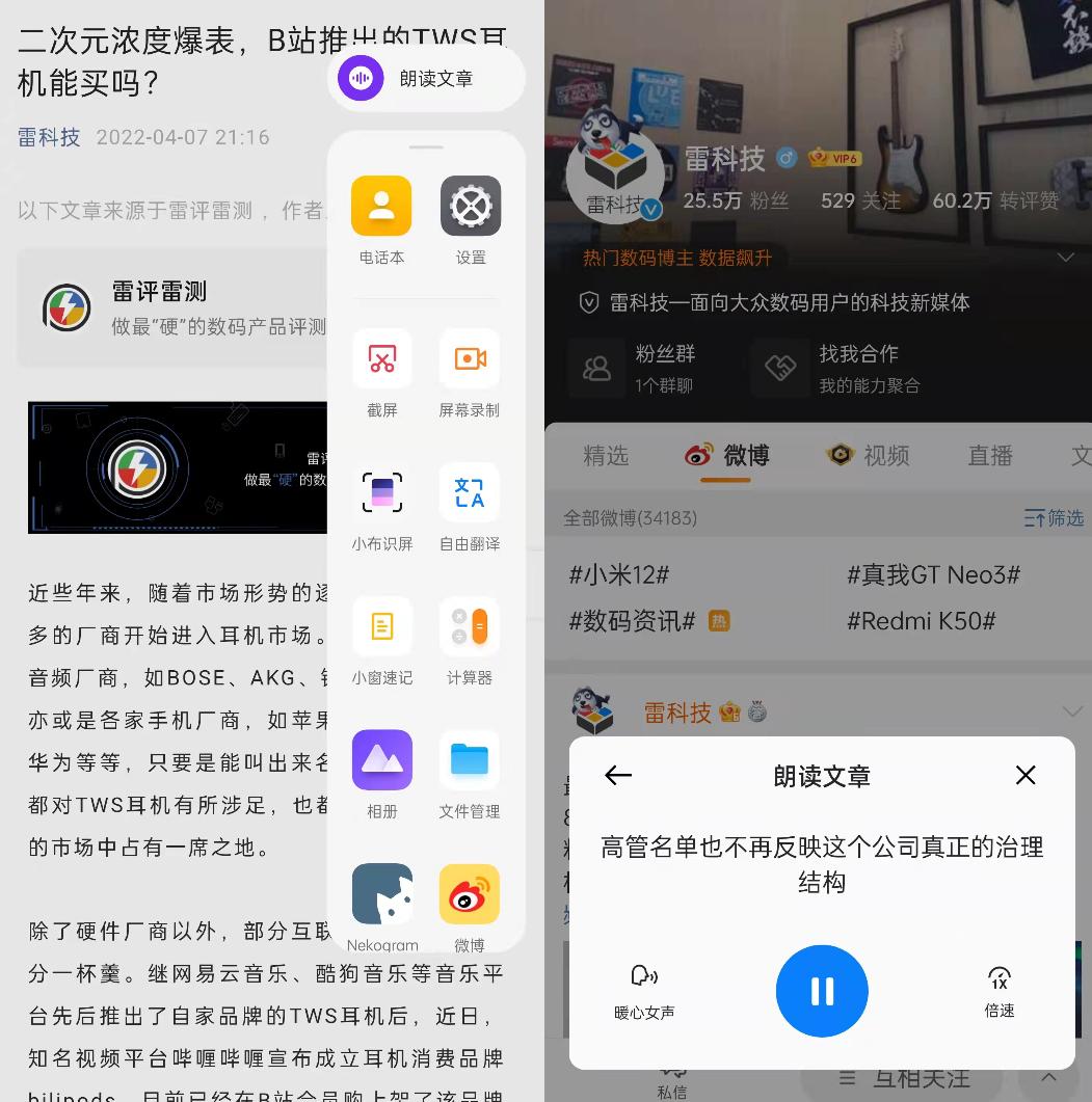 一些手机厂商开始在系统中内置文字转语音功能,典型案例是欧加集团设备搭载的ColorOS:识别到微信文章场景时会推荐“朗读文章”,不仅能设置速度和人声类型,还具备微信进入后台之后继续播放的能力。手机系统的积极改变,覆盖了这些还没有得到充分满足的细分需求。