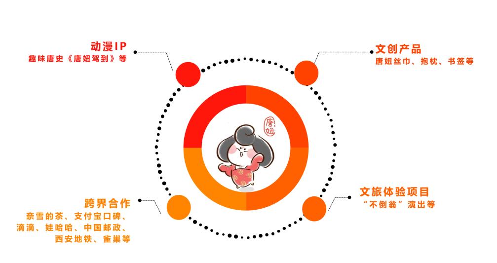 陕西西安的城市IP路径的关键是“拟人化的唐朝少女”,IP较为单一,以动漫IP“唐妞”为主题,将城市调性与历史拟人化作一个可爱的唐朝少女,再围绕“唐妞”展开书籍动漫、文创制作、旅游宣传、联名合作,在大唐不夜城进行“不倒翁小姐姐”互动演出,将西安的城市品格融入到“唐妞”的性格与行为之中,再使“唐妞”作为新潮流的弄潮儿与潮牌合作,加大互联网与短视频宣传,使人们从现代“唐妞”身上认识古代西安、了解西安人民、走进西安生活。