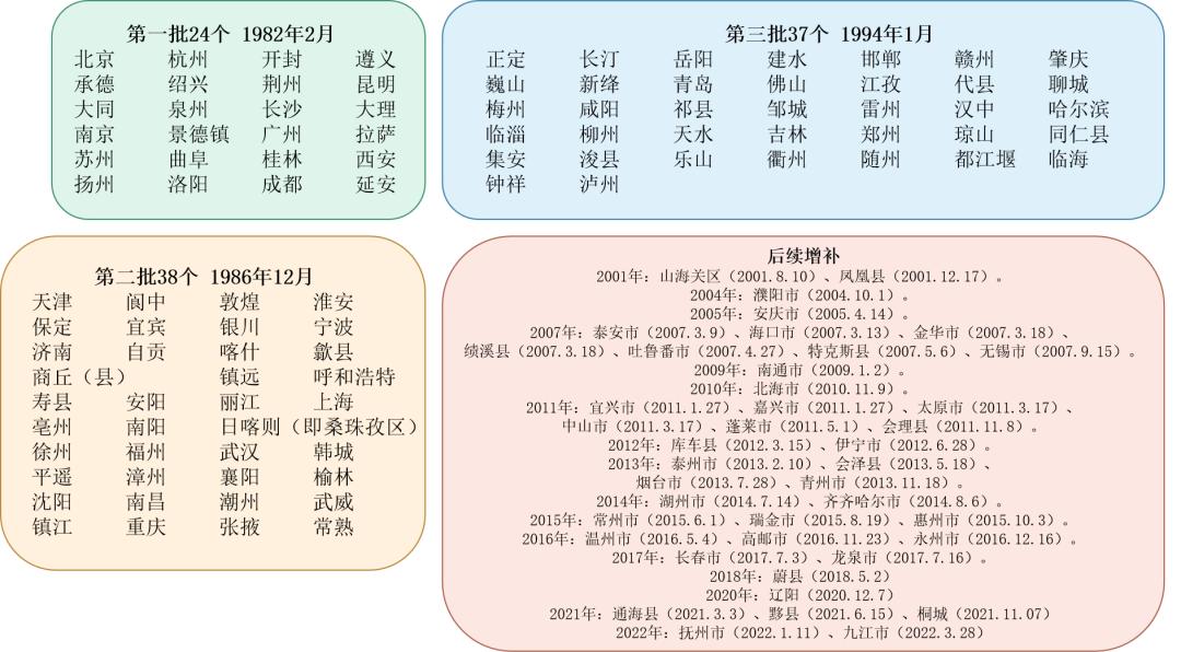 国家历史文化名城的建设类型可按特点分为七类,其中历史古都型较为典型,特指以都城时代的历史遗存物、古都的风貌为特点的城市。2022年,我国首批24座批复的国家历史文化名城迎来了保护与发展的第40个年头。