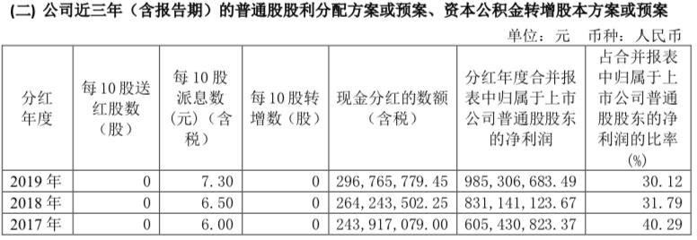 2020年-2021年,则大幅上涨为:以每10股派发现金红利36.9元/37.9元进行派发,分红金额为14.75亿元和15.01亿元,所占净利润的比例升为142.65%和153.06%。