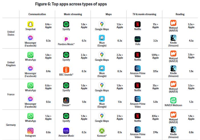 对此,报告列出了各个地区 App Store 类别中的热门应用,并与苹果自己的 App 进行了比较:例如在美国,Spotify 的使用量是 Apple Music 的 1.6 倍,而 Netflix 的流行度更是 Apple TV+ 的 17 倍。