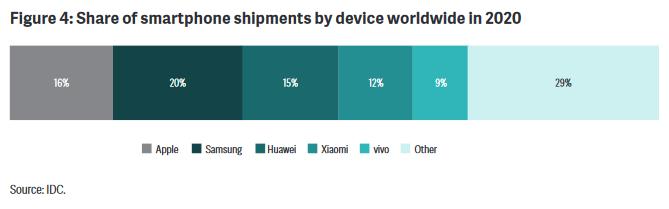 在这之中,消费者对于智能手机的选择范围尤其广泛,不仅可选择不同制造商,还有各类机型及配置。对此,该报告指出:“运行 iOS 的 iPhone 仅占 2020 年全球智能手机出货量的 16%,剩下的 84% 几乎都是 Android 设备,如三星、华为、小米、vivo、Oppo 等等。”