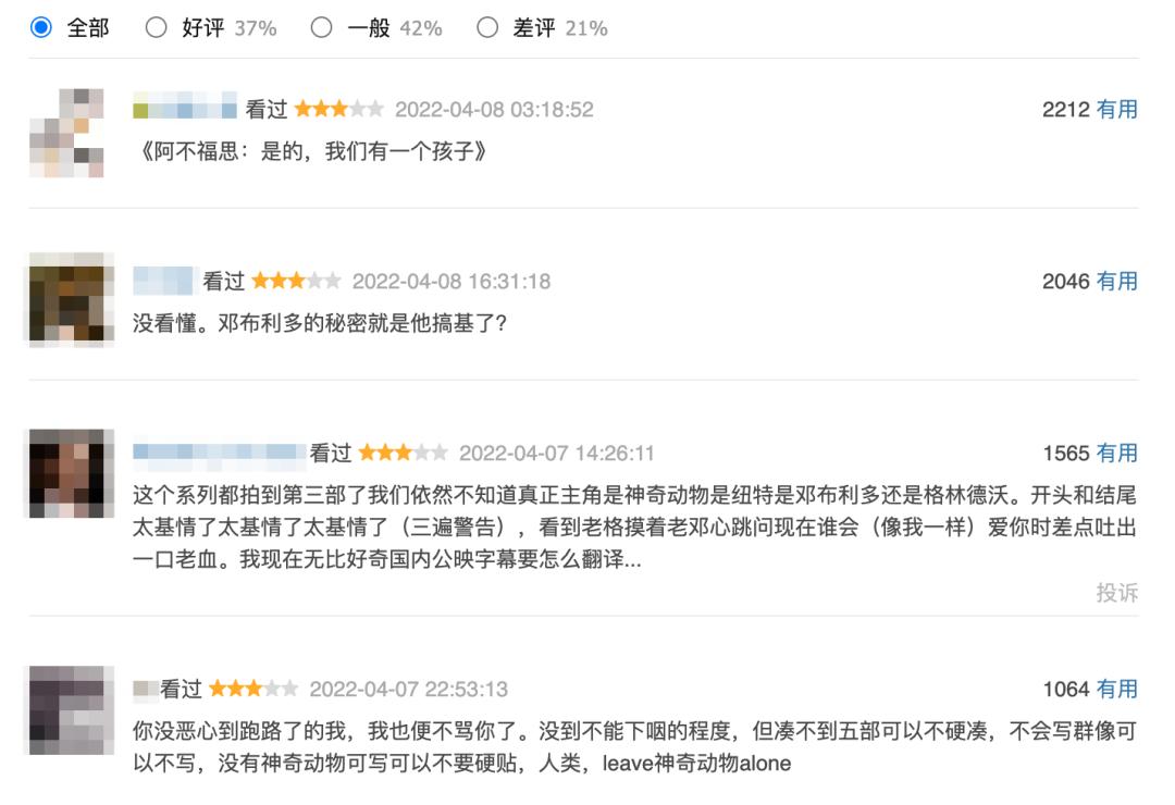 抛开疫情影响不谈,大多数观影结束的人给到这部作品失望的反馈,浏览各个社交平台,经常可见的“主客颠倒严重”“剧情混乱、平淡”“《神奇动物》缺少神奇动物”等类似吐槽声,直接暴露出《神奇动物3》的具体问题。