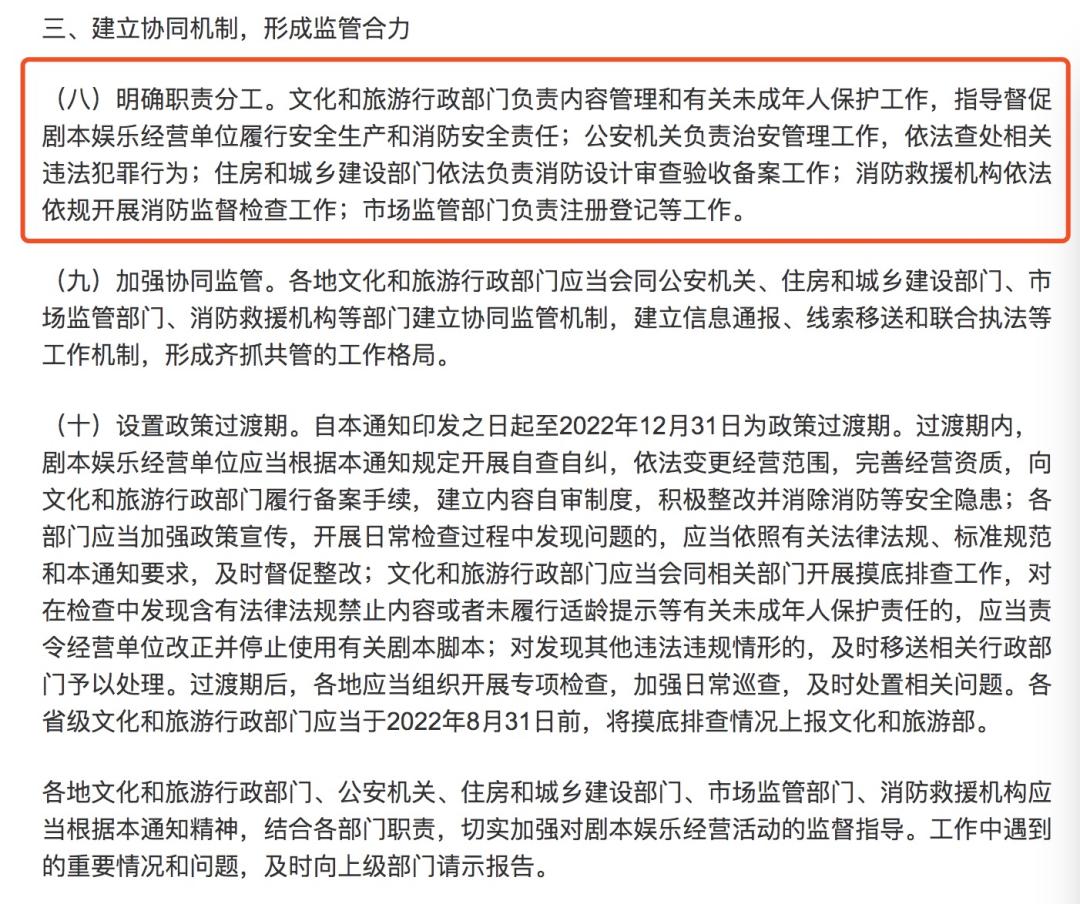 相比《上海市密室剧本杀内容备案管理规定》,此次《征求意见稿》还严格明确了五部门的职责分工,建立协同机制,形成监管合力。