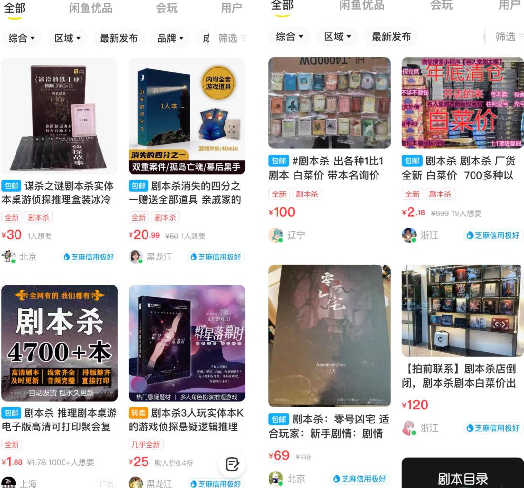 笔者在闲鱼APP以“剧本杀”为关键词搜索,会发现形形色色的剧本低价泛滥销售,价格从1.68元的“白菜价”到数百元不等,最低价仅为1.68元,可买到20个新手本,且生意不错,销量在2000以上。另一方面,连200元以上的“高价转让本”也鲜有见到。