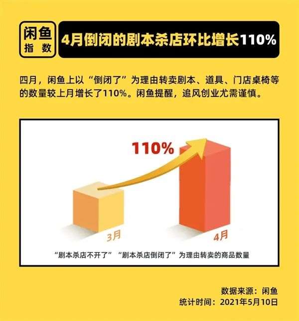 2021年4月,闲鱼APP上以“倒闭了”为由转卖剧本、道具、门店桌椅等的数量较上月增加了110%。