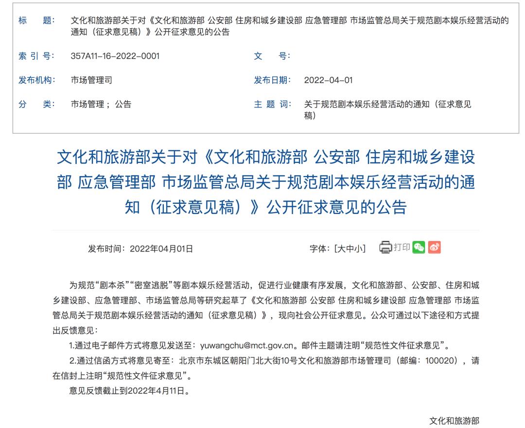 4月1日,文旅部、公安部等五部门研究起草《关于规范剧本娱乐经营活动的通知(征求意见稿)》,同样对剧本杀经营单位的登记与备案进行严格规定,及对表演、场景、服饰等内容自审提出要求。