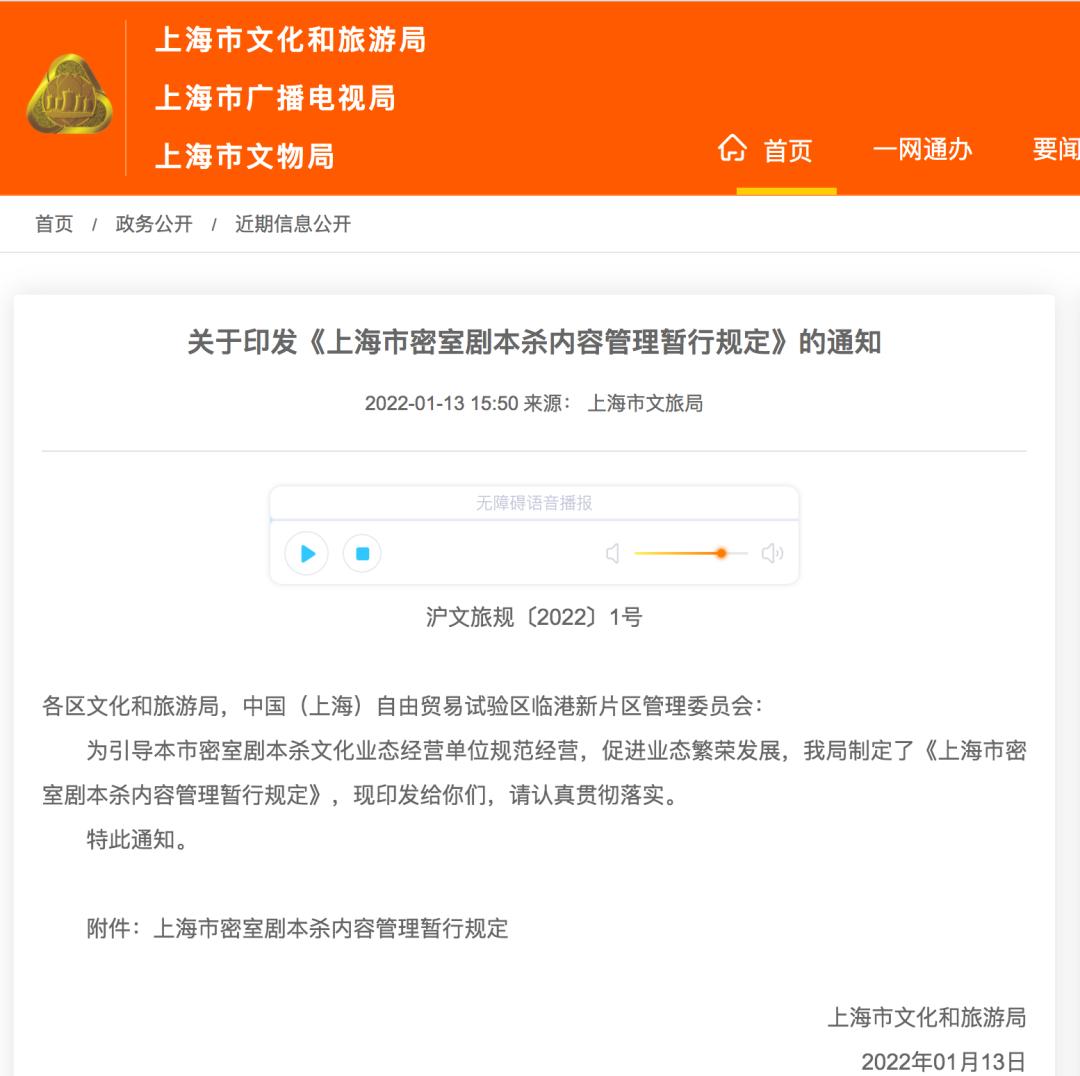今年1月,上海市文旅局正式发布《上海市密室剧本杀内容备案管理规定》,从3月起正式实施,意味着上海成为全国首个正式将密室剧本杀纳入管理的城市。