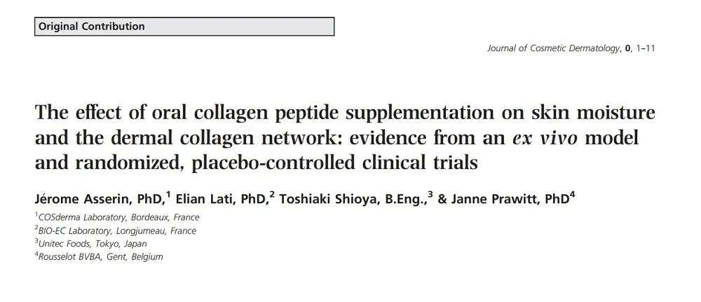 [2].Asserin J, Lati E, Shioya T, Prawitt J. The effect of oral collagen peptide supplementation on skin moisture and the dermal collagen network: Evidence from an ex vivo model and randomized, placebo‐controlled clinical trials. J Cosmet Dermatol. 2015;14(4):291‐301.