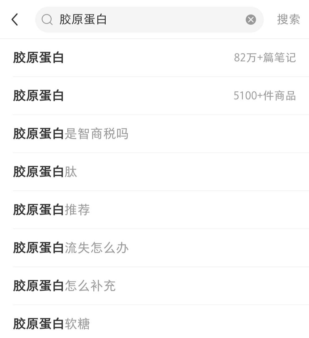 在众多口服美容原料中,胶原蛋白一直是使用率最高的。在“小红书”平台上,胶原蛋白笔记数量达到87w+篇,与胶原蛋白相关的话题包括“胶原蛋白饮品”“胶原蛋白粉”“胶原蛋白软糖”等标签。这也说明,在护肤、美容和营养保健食品中,应用胶原蛋白能够在成分的角度,为产品带来一波流量。