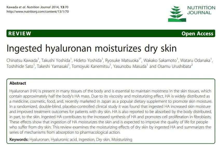 [3]Kawada C, Yoshida T, Yoshida H, et al. Ingested hyaluronan moisturizes dry skin. Nutr J. 2014;13:70.