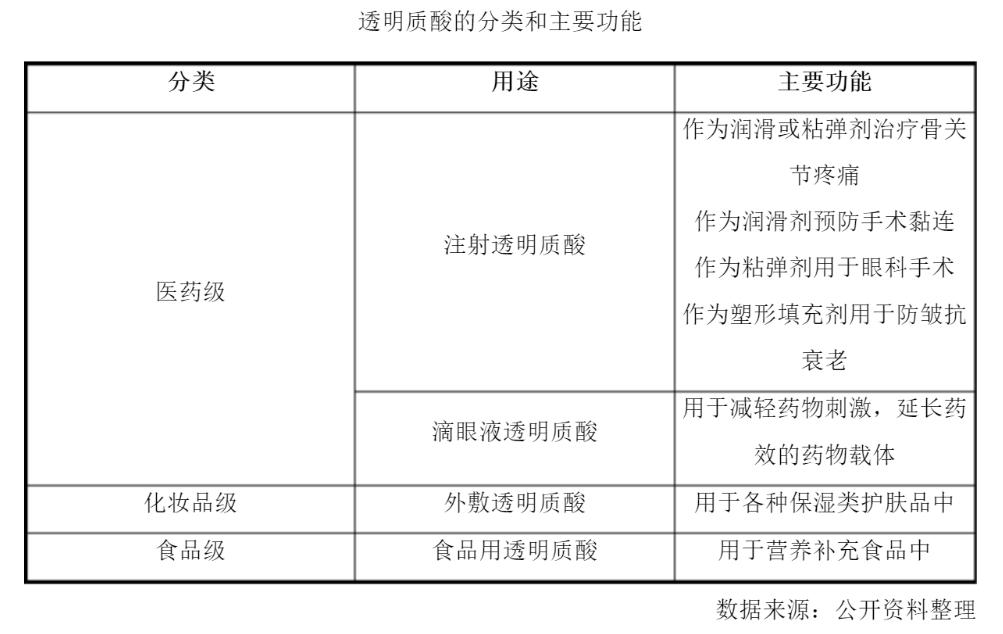 根据应用领域和技术要求的不同,透明质酸主要分为医药级、化妆品级和食品级,具体区别可以见下图:
