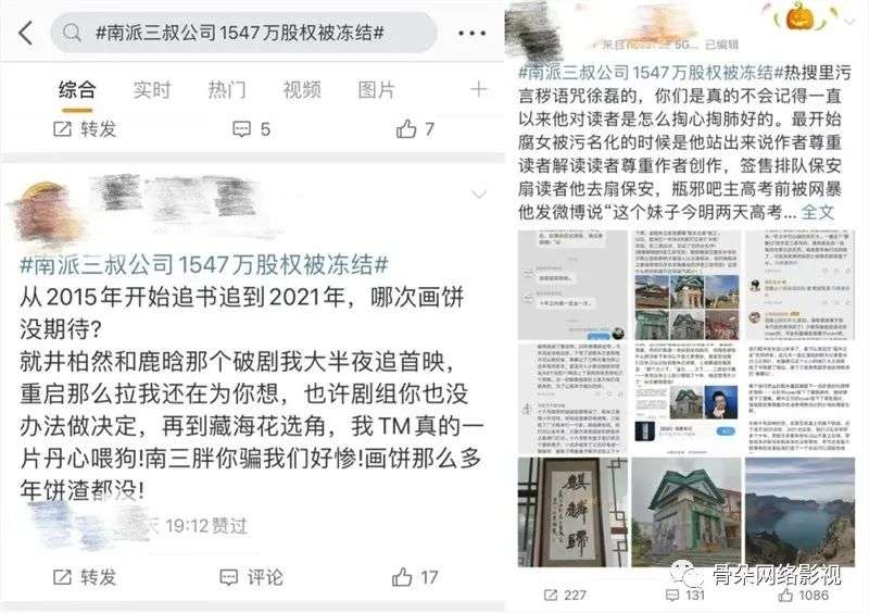 无独有偶,3月份,“南派三叔公司1547万股权被冻结”登上微博热搜,尽管最后新闻澄清此次被冻结资金与南派三叔本人无关,量子泛娱经营状况良好,仍抵挡不住大量“稻米”(《盗墓笔记粉丝》在微博质疑。他们中的大部分都在针对南派三叔创作中“有坑不填”的行为,以及对量子泛娱出品的《盗墓笔记》相关影视作品的质量,表达不满和愤怒。