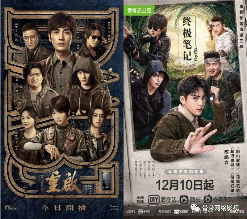 到目前为止,《鬼吹灯》与《盗墓笔记》已经被改编成十多部影视作品,逐渐建立了庞大的“鬼吹灯宇宙”与“盗墓笔记宇宙”。由《鬼吹灯》改编的作品中,比较有代表性的包括电影《九层妖塔》《寻龙诀》、以及网剧《精绝古城》《怒晴湘西》《龙岭迷窟》《云南虫谷》等。而由《盗墓笔记》改编的作品则包括2015欢瑞版网剧《盗墓笔记》、电影《盗墓笔记》、网剧《沙海》《重启之极海听雷》《终极笔记》等等。
