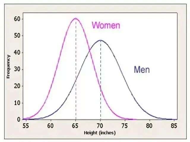 另外,二分法认为人群的分布符合双峰分布,而不是正态分布。举例来说,人类的身高就是双峰分布,比如下图中男性身高多集中在70英寸(177厘米),女人则是65英寸(165厘米);而如果只考虑男人的身高,就是正态分布。在同一个维度上,证据表明人类心理是正态分布,而不是双峰分布。