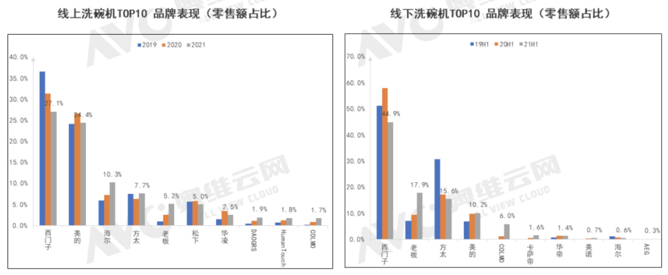 据奥维云网数据,2021年上半年,线上洗碗机零售额占比TOP10中,西门子以27.1%的成绩排名第一,国产美的占比24.4%,紧随其后;线下洗碗机零售额占比TOP 10中,西门子占比44.9%,国产老板电器虽排第二,但占比不及西门子一半。