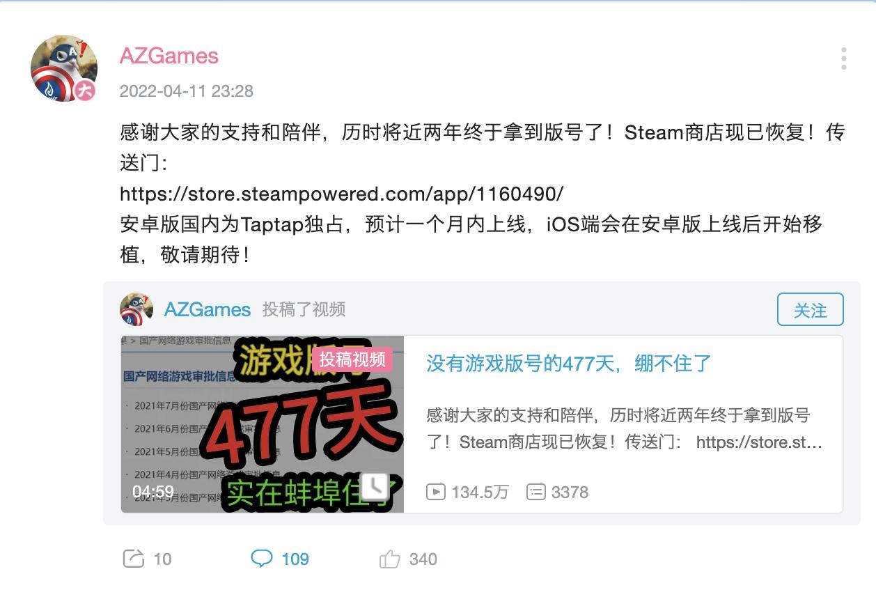“快来个人掐我一下,不是在做梦吧……”@AZGames 在 B 动态上写道:“感谢大家的支持和陪伴,历时将近两年终于拿到版号了!”