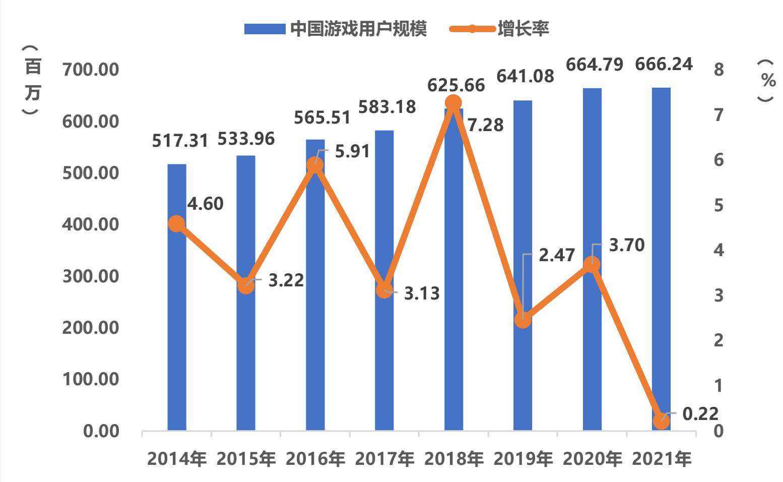 简单来说,国内市场的游戏用户红利已经基本摸到了天花板。游戏工委的数据显示,2021 年,中国移动游戏用户渗透率接近 100%。去年中国游戏用户规模达 6.66 亿人,同比仅微微增长 0.22%。前几年,虽然用户增长缓慢,但是用户规模每年大多还是以千万级增长,而去年的增幅与 2020 年相比,用户规模变化不大。