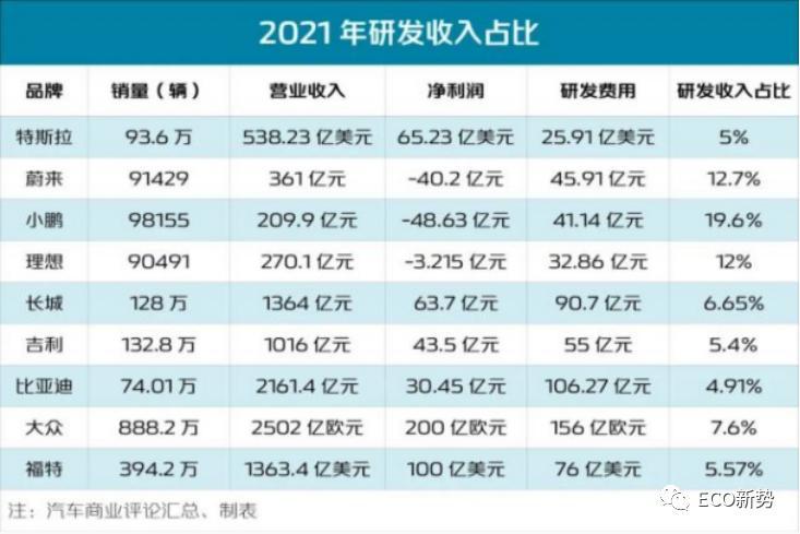 3月25日,StockApps.com发布了一份报告,比较了所有大型汽车制造商每辆车的研发支出,其中特斯拉每辆汽车的研发费用为2984美元,是行业平均值(约1000美元)的近三倍。而根据汽车商业评论统计,国内造车新势力虽然亏损,但是同样在加大研发投入,“蔚小理”的研发收入比在2021年均超过10%,小鹏更是接近20%。
