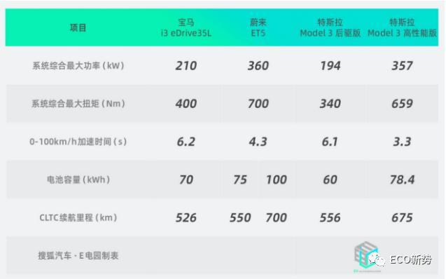 新版宝马i3 eDrive35L、特斯拉Model3 Performance以及蔚来ET5价格相近,但是从性能对比看,根据搜狐汽车整理的数据,无论是百公里加速时间、还是续航能力,i3都要略逊一筹。