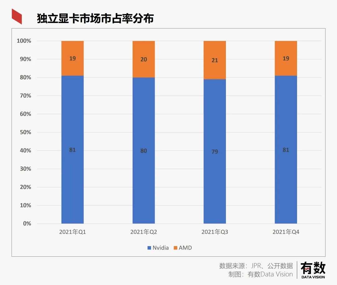 在2021第四季度独立显卡的市场数据统计报告中,英伟达占据了81%的市场份额,AMD则拥有剩下的19%。可以说在独立显卡这个市场上,英伟达一家独大。