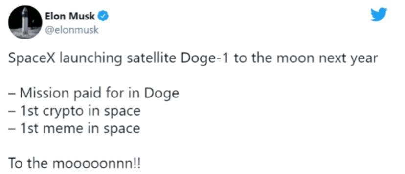 2021年5月1日,推特著名网红特斯拉CEO马斯克表示,Space X将在明年第一季度发射一颗名为“Doge-1”的卫星到月球上,该登月任务将使用狗狗币(Dogecoin)作为唯一付款方式。而此前,特斯拉更是接受比特币作为支付方式,并且主动投资加密货币领域。