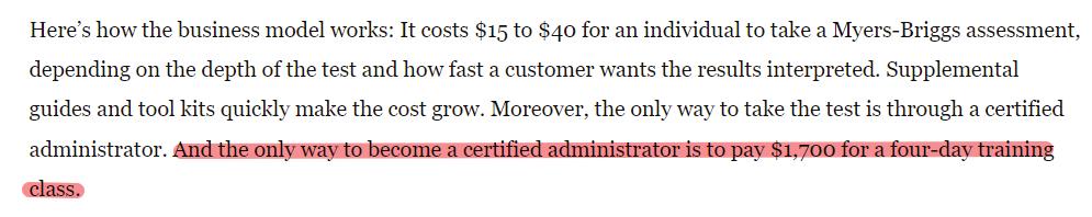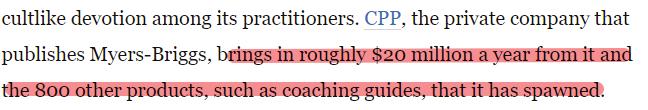 比如很多人不知道,在握有 MBTI 人格测试版权的 CPP 公司主页,做一套正版 MBTI 测试要花 49.95 美元。