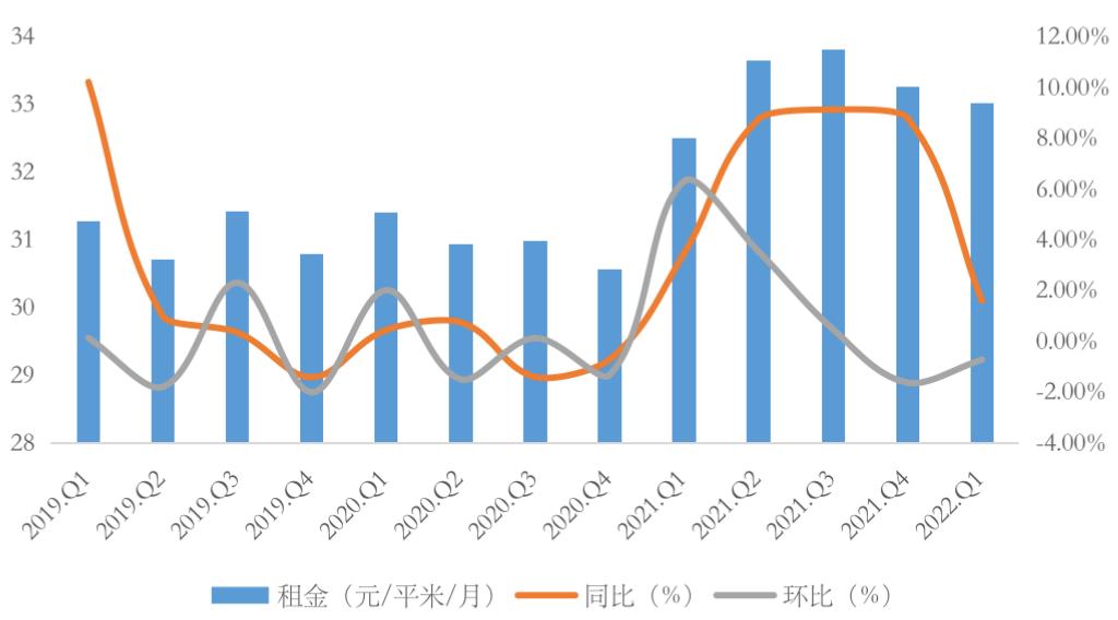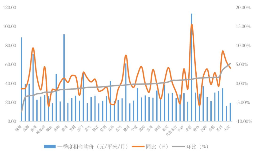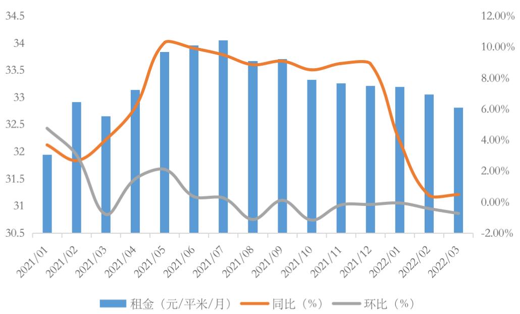 值得注意的是,一季度租金已呈连续下跌趋势,自2021年10月租金已连续6个月下跌。