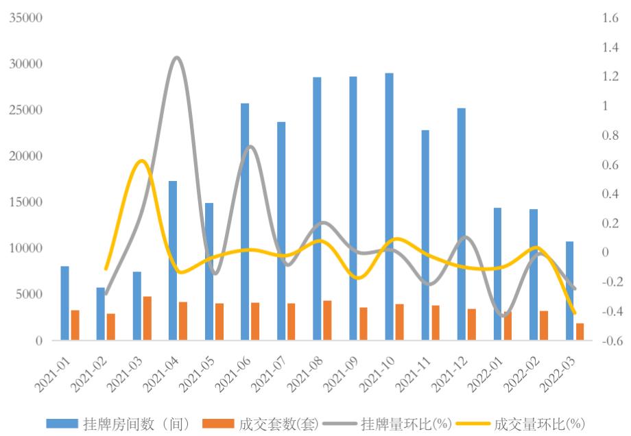 图:2021-2022年3月上海个人房源挂牌及成交变动