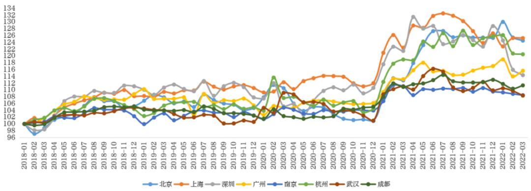 以2018年1月为基期,核心8城租赁价格指数出现下降。截至2021年3月,8城市租赁价格指数区间仍然位于97.09-132.5,城市间差异较大。