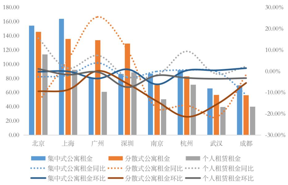 从房源类型来看,无论是集中式公寓还是分散式公寓,亦或是个人房源,一季度8城租金呈现普降趋势。
