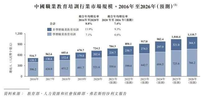 弗若斯特沙利文报告显示,中国职业教育培训行业的市场规模以收入计算,从2016年的5167亿元增至2020年的7242亿元,复合年均增长率为8.8%,预期到2026年将达到11107亿元的规模。