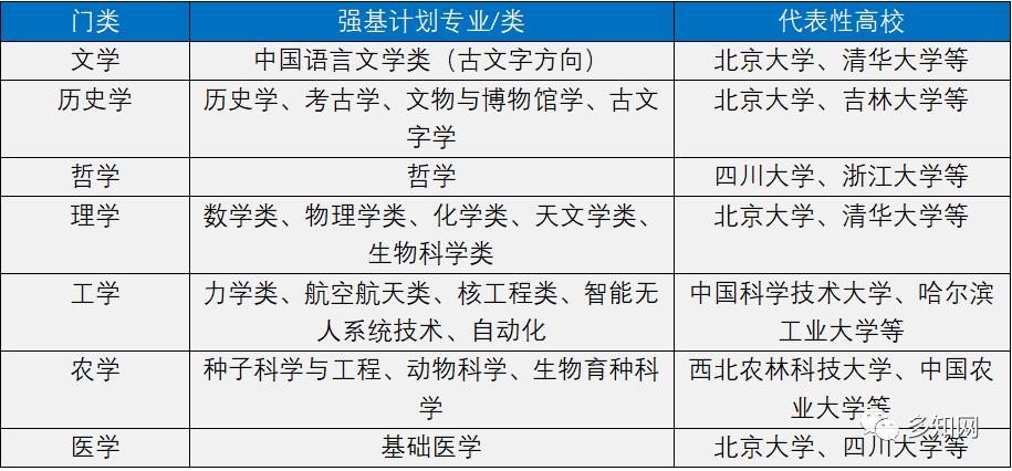 所以,我们可以看到,强基计划实施三年以来,招生专业表现出非常大的延展性。本科专业的13大学科门类,强基计划已经涉及到理、工、农、医、文、史、哲7个,经笔者汇总如下图所示。