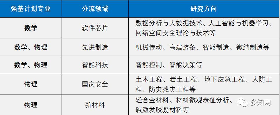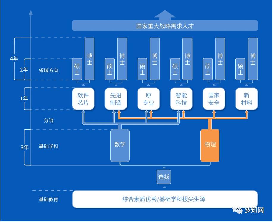 其中,“3”代表本科的前3年,“1”代表本科的第4年,“X”代表研究生阶段,为2年(硕士)或4年(直博)。从上图,我们可以看出,如果某同学被强基计划数学(物理)专业录取后,那么本科前3年,主要学习内容为数学(物理),大四那年,确定分流方向:数学专业有可能被分流到软件芯片、先进制造、智能科技等领域,或者继续攻读原专业;物理专业有可能被分流到先进制造、智能科技、国家安全、新材料等领域,或者原专业。