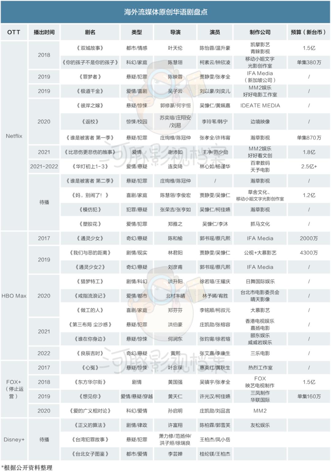 整体而言,参与华语剧之战的主要选手是Netflix、HBO Max和Disney+,在2019年停止服务之前,FOX+同样身处战局。而综合各家成绩单,除了《心冤》《东方华尔街》等少数与香港及内地合作的作品,几乎所有平台输出的项目都以台剧为主。