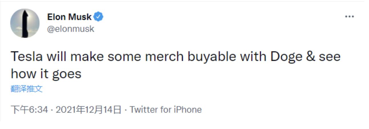 去年12月,马斯克表示,未来将可使用狗狗币(Dogecoin)购买一些特斯拉周边产品,狗狗币一度飙涨33%,24小时涨幅超20%。