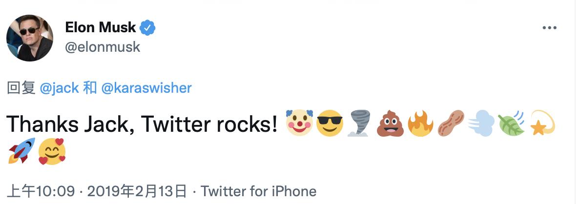 马斯克以感谢和赞美回应,并表示推特很赞!还有11个难以理解的表情符号,包括小丑、龙卷风、一堆便便、花生和在风中飘动的树叶。