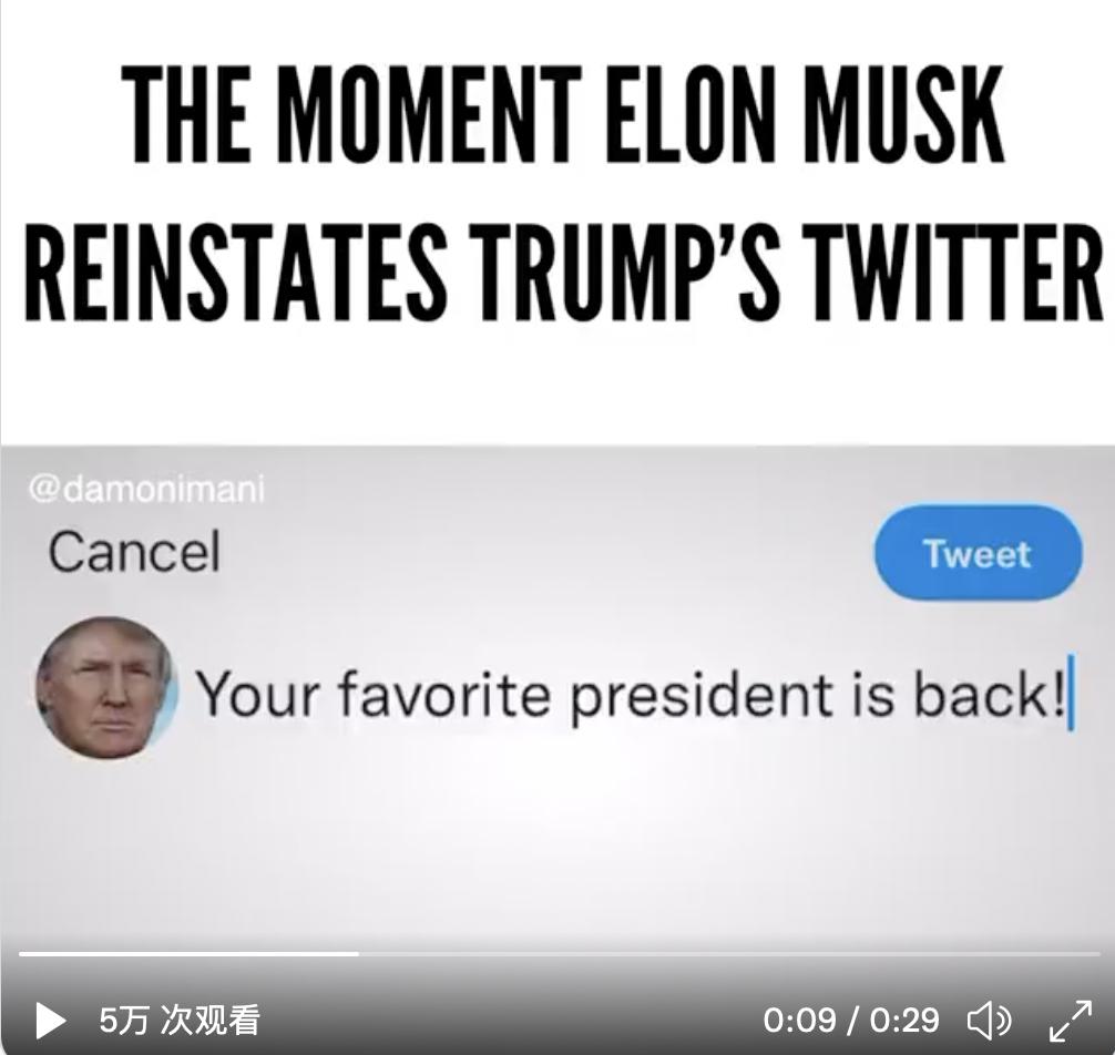 马斯克号称追求“言论自由”,加之其与拜登的尴尬关系,推友们纷纷发文“解封川普”,一个“最爱的总统回来了”的视频广泛传播。