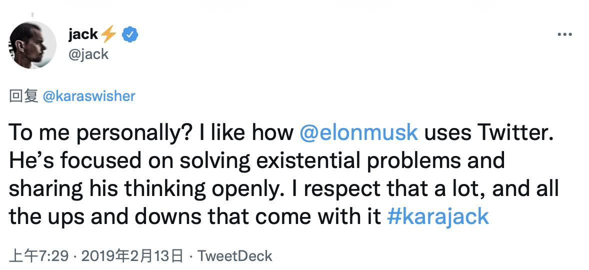 2019年2月,当被问及推特上最令其兴奋的人时,多西向马斯克致敬。多西发推文称,“我喜欢马斯克使用Twitter的方式,他专注于解决存在的问题,并公开分享他的想法。我非常尊重这一点,以及随之引发的讨论。”