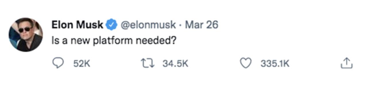 3月26日,爱发推特的马斯克连发数条推文,表达对推特的不满,诸如“推特消亡了吗?”、“你们需要一个新的社交平台吗?”、“推特没有言论自由了,应该如何修正?”此类的灵魂拷问,一时间引起推友们的热议,也有网友调侃道,你应该买下推特。